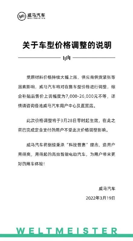 此前, 小鹏汽车发布公告称,受上游原材料价格持续大幅上涨影响,小鹏汽车对在售车型的价格进行调整,补贴前售价上调1.01-2.0万元不等,此次调价将于3月21日0时起正式生效,在此之前通过官方渠道支付定金的用户不受此次价格调整影响。