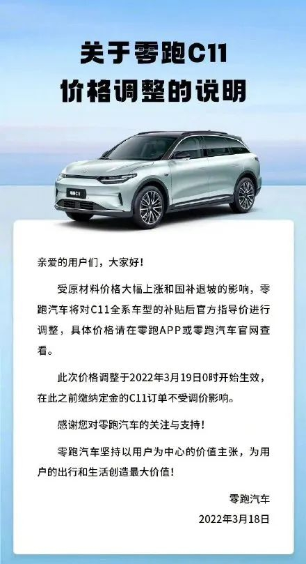 日前,零跑汽车官方宣布,受原材料价格大幅上涨和国补退坡影响,零跑汽车C11全系涨价,零跑C11豪华版补贴后价格从15.98万元上涨至17.98万元,尊享版和性能版涨价3万元,售价为20.98万元和22.98万元