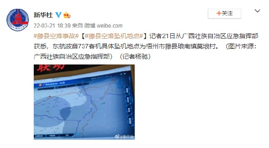 记者21日从广西壮族自治区应急指挥部获悉,东航波音737客机具体坠机地点为梧州市藤县琅南镇莫埌村。(图片来源:广西壮族自治区应急指挥部)(记者杨驰)