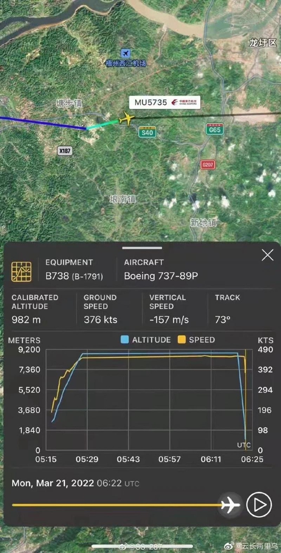 据公开信息显示,执飞本次云南昆明至广东广州MU5735航班的飞机系编号为B1791的波音737-800型客机,机龄6.8年。该航班预计起飞时间为13时10分,实际起飞时间飞时间为13时15分,预计落地时间为15时05分,但客机却在飞至广西梧州境内失联后坠毁,坠毁前飞行高度为8000米左右。