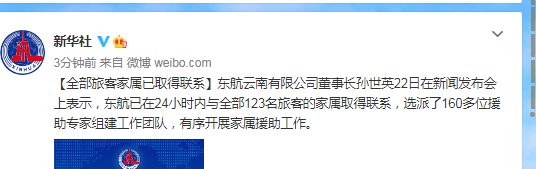 东航云南有限公司董事长孙世英22日在新闻发布会上表示,东航已在24小时内与全部123名旅客的家属取得联系,选派了160多位援助专家组建工作团队,有序开展家属援助工作。