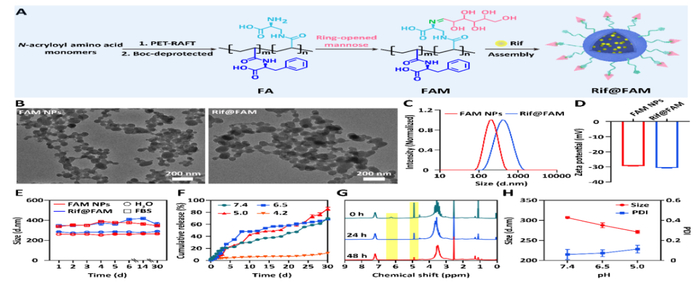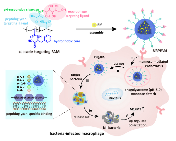 为此,北京化工大学生命科学与技术学院王兴教授课题组巧妙地设计了一种新型的具有级联靶向功能的药物递送系统(FAM DDS),该DDS通过级联靶向巨噬细胞和胞内耐甲氧西林金黄色葡萄球菌(MRSA),实现抗生素利福平(Rif)的原位精准递送,克服了顽固胞内菌休眠状态及隐匿位置削弱抗生素性能的瓶颈问题。与此同时,Rif@FAM能够上调巨噬细胞M1/M2极化,增强巨噬细胞免疫清除作用,协同Rif实现细胞内MRSA的高效清除。