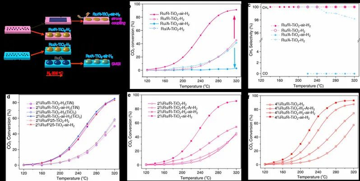 多相催化技术化工领域的最核心技术,广泛应用于大宗与精细化学品生产、环境保护及能源转换等诸多领域。其催化性能(活性、选择性、稳定性)不仅受金属纳米颗粒的成分、形貌、尺寸的影响,也广受载体影响,因此金属载体相互作用(metal-support interaction)是催化科学的核心问题。大量研究表明,金属与载体间可通过强相互作用(SMSI)、界面电荷转移、形成边界层等形式调控催化剂的活性与选择性。然而,其中的一些关键科学问题至今依然不清楚,比如哪些结构因素是调控不同MSI模式的关键,SMSI发生的规律及其与催化性能间构效关系的本质。该工作揭示出金属-载体接触界面的性质在MSI模式中扮演着关键作用(Nat. Commun. 2022, 13, 327)。金属-载体界面接触是所有MSI现象发生的基础,因此如何从原子层面理解这种相互作用是深刻揭示多相催化领域关键科学问题的关键。该研究选择Ru/TiO2作为模型体系,通过是否退火来改变Ru与TiO2界面相容性。R-TiO2 ( Rutile )与A-TiO2 (Anatase) 虽然有着相同的化学组成,但是晶体结构不同,而RuO2与R-TiO2有着相同的晶体结构,因此可以在两种载体上构建不同的接触界面。将Ru负载在TiO2表面,通过对比直接还原与退火后再还原两种处理方式在CO2甲烷化中催化性能的转变,发现退火处理导R-TiO2与A-TiO2载体上发生两种截然相反的催化现象。R-TiO2载体上催化活性明显提升,而在A-TiO2载体上活性急剧下降并伴随着选择性的转变。通过控制退火的条件,发现空气在退火过程中扮演着重要的作用。