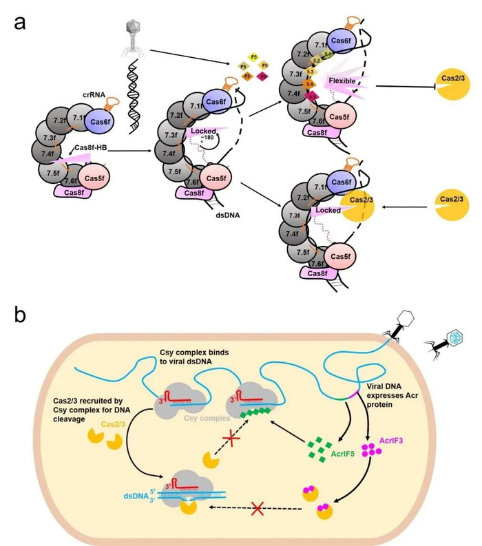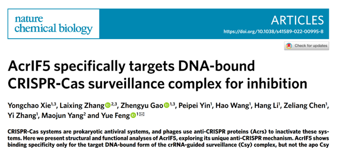 2022年3月18日,我校生命学院冯越教授课题组在《自然·化学生物学》杂志在线发表了题为AcrIF5 specifically targets DNA-bound CRISPR-Cas Surveillance Complex for inhibition的研究论文。论文报道了Csy-dsDNA-AcrIF5的冷冻电镜结构及AcrIF5蛋白的晶体结构,揭示了AcrIF5抑制I-F型CRISPR-Cas系统的分c子机制。