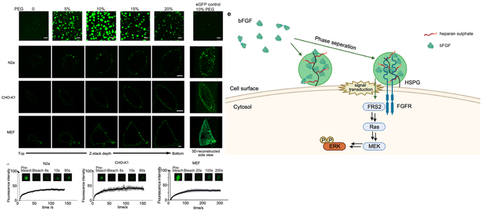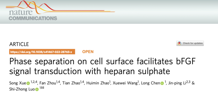 2022年3月2日,《Nature Communications》在线刊登了我校生命科学与技术学院罗施中教授的最新研究成果“Phase separation on cell surface facilitates bFGF signal transduction with heparan sulphate”。该文首次揭示了碱性成纤维生长因子(bFGF)可以在细胞膜表面硫酸乙酰肝素的作用下发生细胞外液液相分离(LLPS),进而实现下游信号通路的激活,这一新的发现为细胞外膜上蛋白质相分离的相关研究提供了新的理论及实验依据。