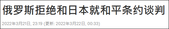 当地时间3月21日,俄罗斯外交部发布消息称,由于日本就乌克兰局势做出非友好行为,俄罗斯拒绝与日本就和平条约问题继续进行谈判。