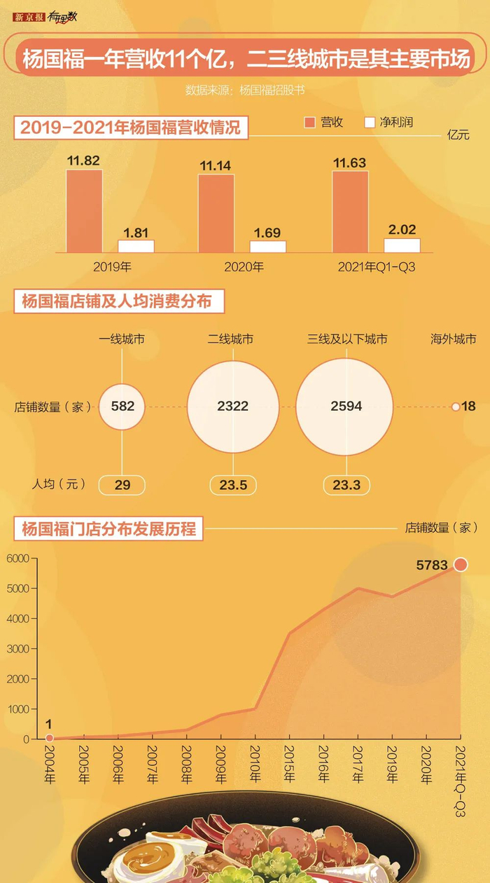 2010年,杨国福把店铺开出东北三省,并在2015年把总部迁到上海,受中国餐饮市场的快速增长影响,杨国福麻辣烫开始以每年1000家的速度快速扩张。截至2021年9月30日,杨国福品牌旗下共有5783家餐厅,二三线城市是其主要根据地。