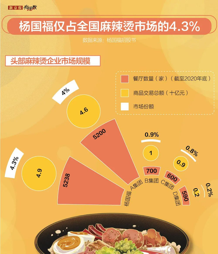 据招股书,以020年商品交易总额计,杨国福以49亿元排名第一,市场份额4.3%,而第二名张亮麻辣烫商品交易总额为46亿元,市占率4%,两者仅有一线之差。从门店数量看,2020年杨国福共有餐厅5238家,张亮为5200家,几乎不相上下。
