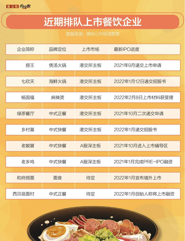 除上述企业,还包括冲击港股的海鲜火锅连锁餐厅七欣天、二次递交上市申请的乡村基等。这些寻求上市的餐企中,选择港股上市的占据一半,包括杨国福、七欣天、乡村基、和府捞面。选择A股上市的占三分之一,包括老乡鸡等品牌。