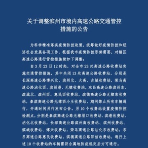 自3月23日12时起,对全市23处高速公路收费站实施交通管控措施,其中关闭13 处高速公路收费站,分别是长深高速公路博兴北、滨州北、大高、古城收费站,荣乌高速公路沾化西、滨州港、无棣收费站,东吕高速公路滨州东、滨城北、滨州西、惠民西收费站,滨德高速公路无棣东收费站,秦滨高速公路无棣西小王收费站,期间禁止所有车辆通行,开通时间另行发布公告。另10个收费站设置疫情防控检测点,分别是秦滨高速公路无棣埕口收费站、滨港收费站、沾化北收费站,长深高速公路滨州南收费站、滨州收费站、滨城收费站、博兴收费站,荣乌高速公路沾化东收费站,东吕高速公路惠民收费站,滨德高速公路阳信收费站,通行上述10个收费站的车辆需符合属地防疫规定后方可通行。