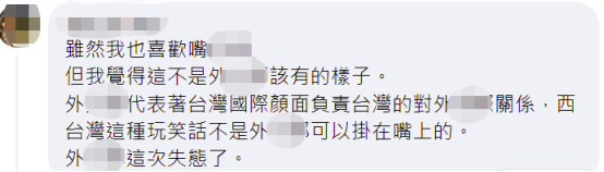 有网友觉得这不是台外事部门该有的样子,“‘西台湾’这种玩笑话不是‘外交部’可以挂在嘴上的。‘外交部’这次失态了。”↓