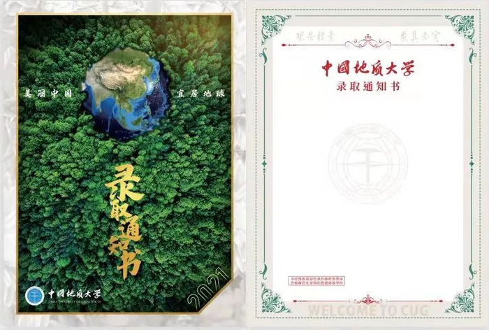 2021年本科生录取通知书由封皮和正本组成,整套通知书以“美丽中国·宜居地球”为主题,以蓝色和绿色为主色调,融入校训、校歌、校徽、校名、校园标志性建筑等校本标识,绘有地球、森林、蓝天、白云、山脊、生物、地层等元素,充分彰显学校“谋求人与自然和谐发展”的价值观和“共创美丽中国 共建宜居地球”的使命观。