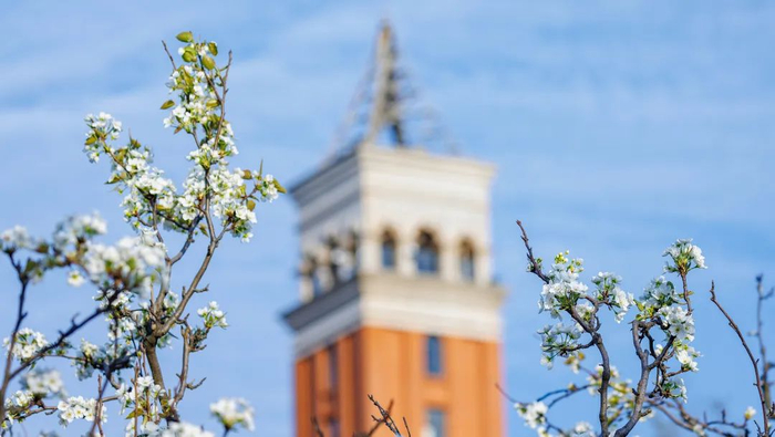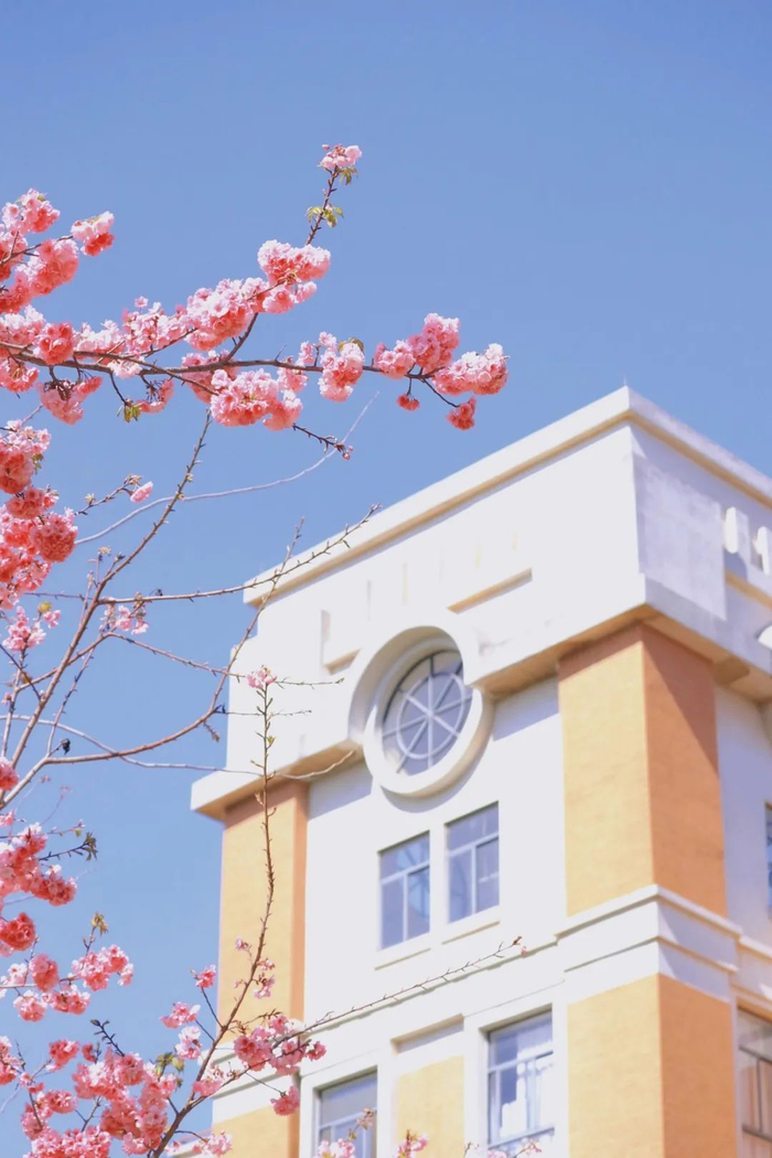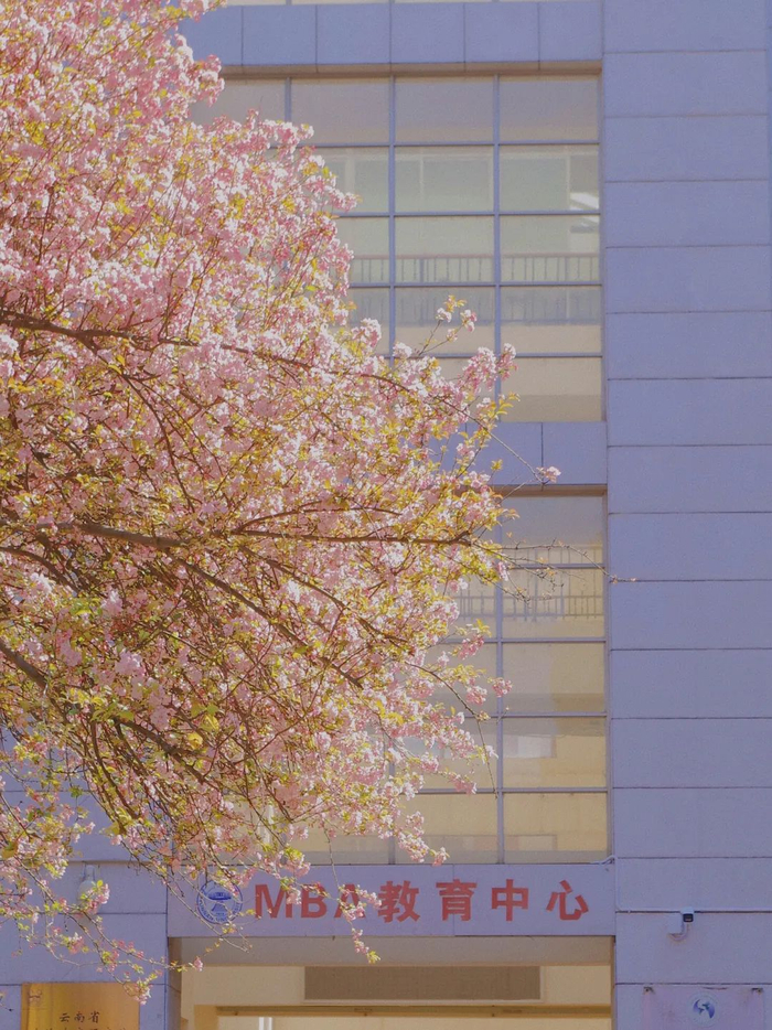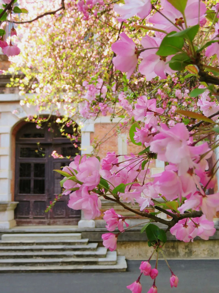 海棠花花瓣白里透粉,花姿妩媚,花色娇艳,是春日极具风情的信笺。就连唐玄宗也曾将杨贵妃比作会说话的垂丝海棠,这样的花中贵妃,轻柔忧郁的海棠美人玉立在校园,又有谁不为之心动呢!