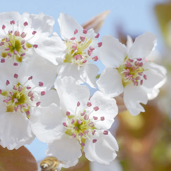 梨树,落叶乔木,叶圆如大叶杨,干有粗皮外护,枝撑如伞。春季开花,花色洁白,如同雪花,具有淡淡的香味。花先于叶开放或同时开放,伞形总状花序;萼片5,反折或开展;花瓣5,具爪,白色稀粉红色;雄蕊15-30,花药通常深红色或紫色;花柱2-5,离生,子房2-5室,每室有2胚珠。