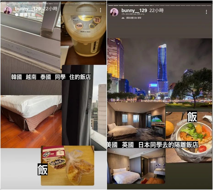 与此同时,她在Instagram Story晒出韩国、越南、泰国赴台留学生和美国、英国、日本留学生所住防疫旅馆的对比照,并称自己和日本同学付的房费都是每天2100新台币(约合466元人民币),但入住的旅馆条件天差地别。
