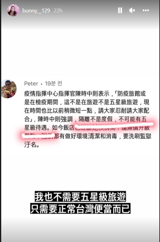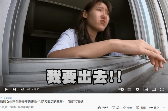 据台湾“中时新闻网”3月26日报道,韩国籍网红“宝妮”日前赴台湾师范大学学中文,隔离期间在YouTube发布视频控诉台防疫旅馆卫生状况差、提供冷的餐食,如同“监狱”,并在Instagram晒出韩、泰、越赴台留学生和美、英、日留学生所住防疫旅馆的差别。
