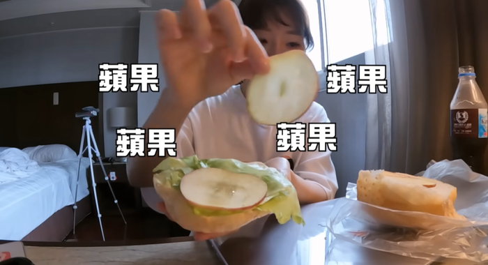 接着她晒出隔离第一天的早餐,一个红茶茶包和一个只有苹果片和生菜的汉堡,她最终没能下咽、选择饿着。