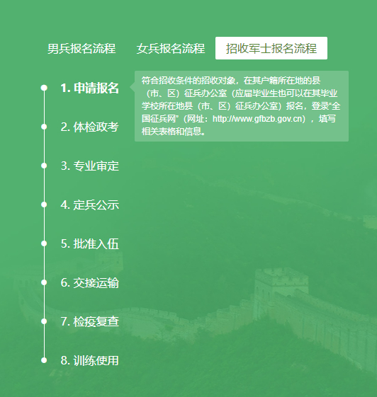 2、完成网上报名后,请密切关注网上审核结论,跟踪掌握应征报名进展情况,保持通信联络顺畅,根据应征地兵役机关通知要求参加应征。