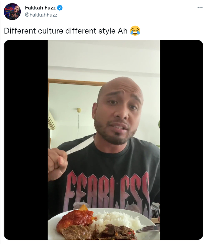 新加坡喜剧演员Fakkah Fuzz甚至还在推特上恶搞了这段视频。在视频中,他称,“我们用刀叉吃米饭的方式有点不一样,首先,我们把叉子放下,然后在吃米饭前,我们会拿起刀捅向自己的脖子。”在嘲讽了查伦奇分享的就餐礼仪后,他放下餐刀,徒手抓起菜就着一团米饭塞进嘴里。
