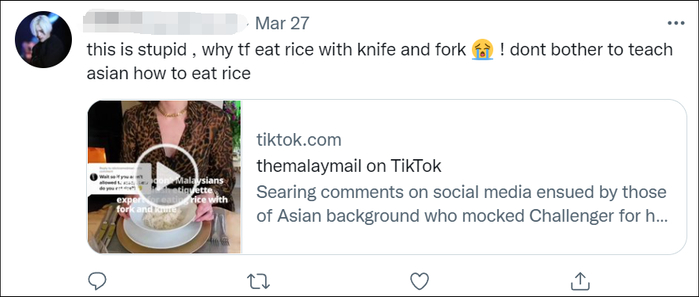 “这是愚蠢的,要用刀叉吃米饭是什么鬼!请不要费心教亚洲人怎么吃米饭好吗。”