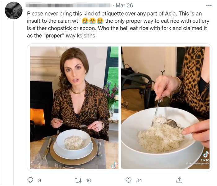 “请不要把这种礼仪带到亚洲的任何地方。这是对亚洲人的侮辱,用餐具吃米饭的唯一正确方法是用筷子或勺子。谁会用叉子吃米饭,还声称这是‘正确’的方式。”