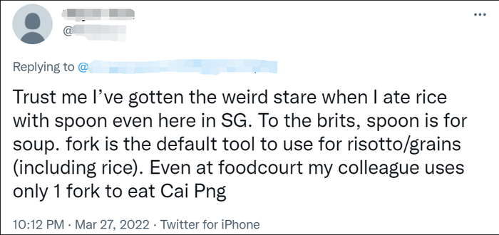 不过,也有网民“现身说法”称,“相信我,即使在新加坡,当我用勺子吃米饭时,我也会受到奇怪的注视。对英国人来说,勺子是用来喝汤的,叉子才是用于吃烩饭/谷物(包括大米)的默认工具。即使是在美食广场,我的同事也只用一把叉子吃菜饭。”