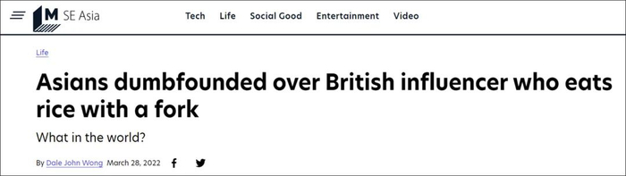 Mashable报道称,亚洲人被英国网红用叉子吃米饭惊呆了