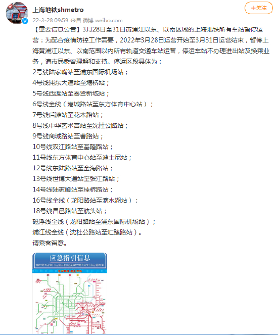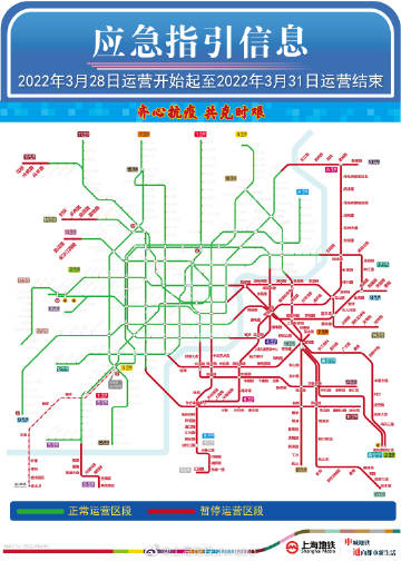 3月28日至31日黄浦江以东、以南区域的上海地铁所有车站暂停运营