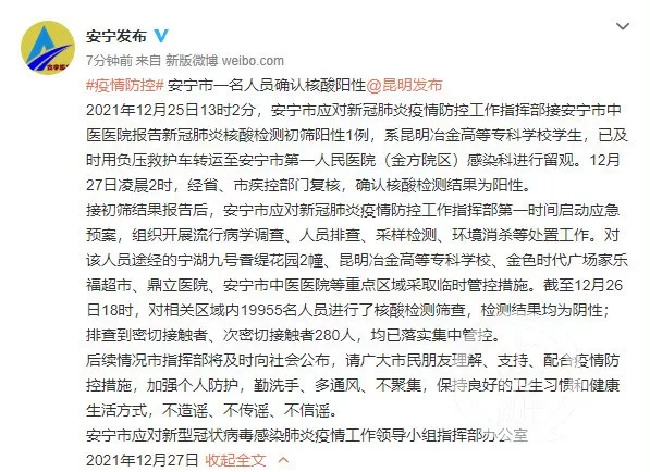 12月25日13时2分,安宁市中医医院向当地政府报告了该学生初次核酸检测为阳性的情况,同时将其用负压救护车转运至安宁市第一人民医院感染科进行留观。12月27日凌晨2点,云南省、昆明市疾控部门复核确认该学生核酸检测结果为阳性。