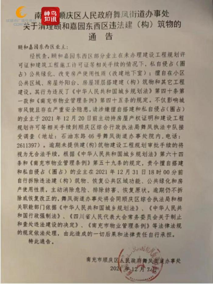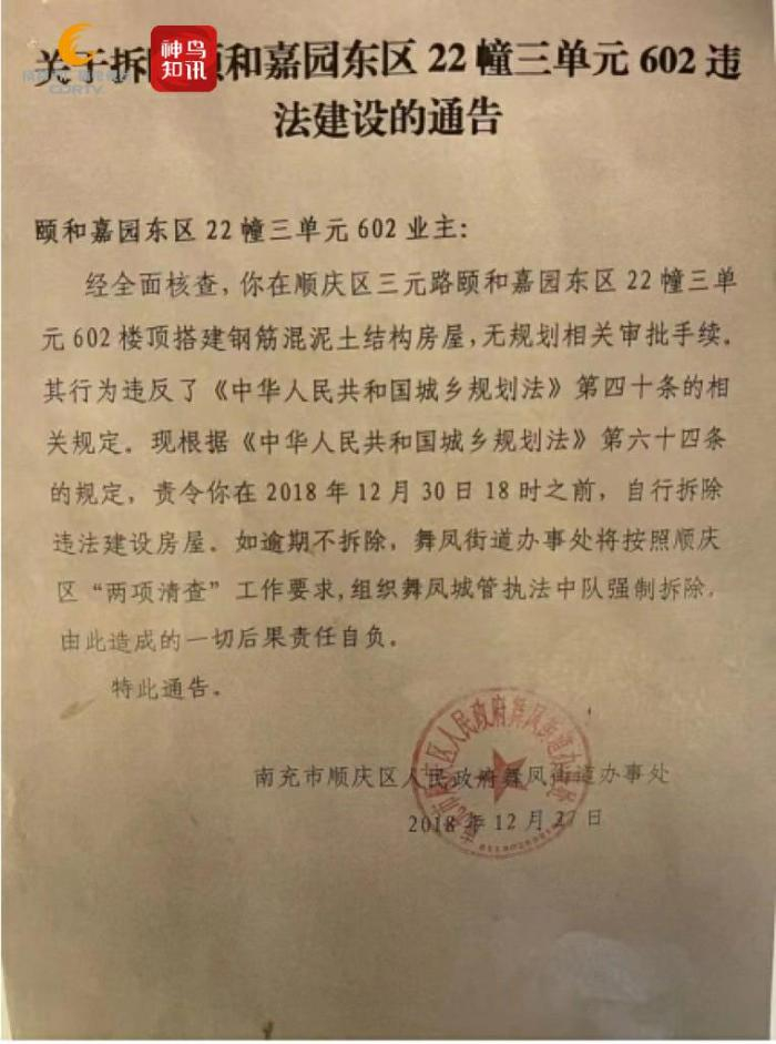 直到2018年12月27日,南充市顺庆区舞风街道办事处的一份《关于拆除颐和嘉园东区22幢三单元602违法建设的通告》终于呈现在业主们面前。