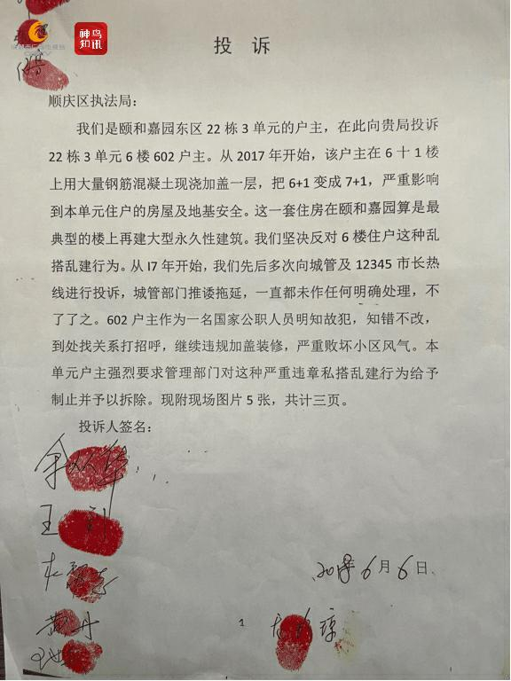 该单元业主们认为,602号业主私自占用公共区域在楼顶加层修建房屋,严重危害到了单元楼整体房屋结构及地基安全,给整个单元楼带来严重安全隐患,侵害了其他业主的合法权益。为此,他们陆续向南充市顺庆区以及南充市相关职能部门反映楼顶违建情况。