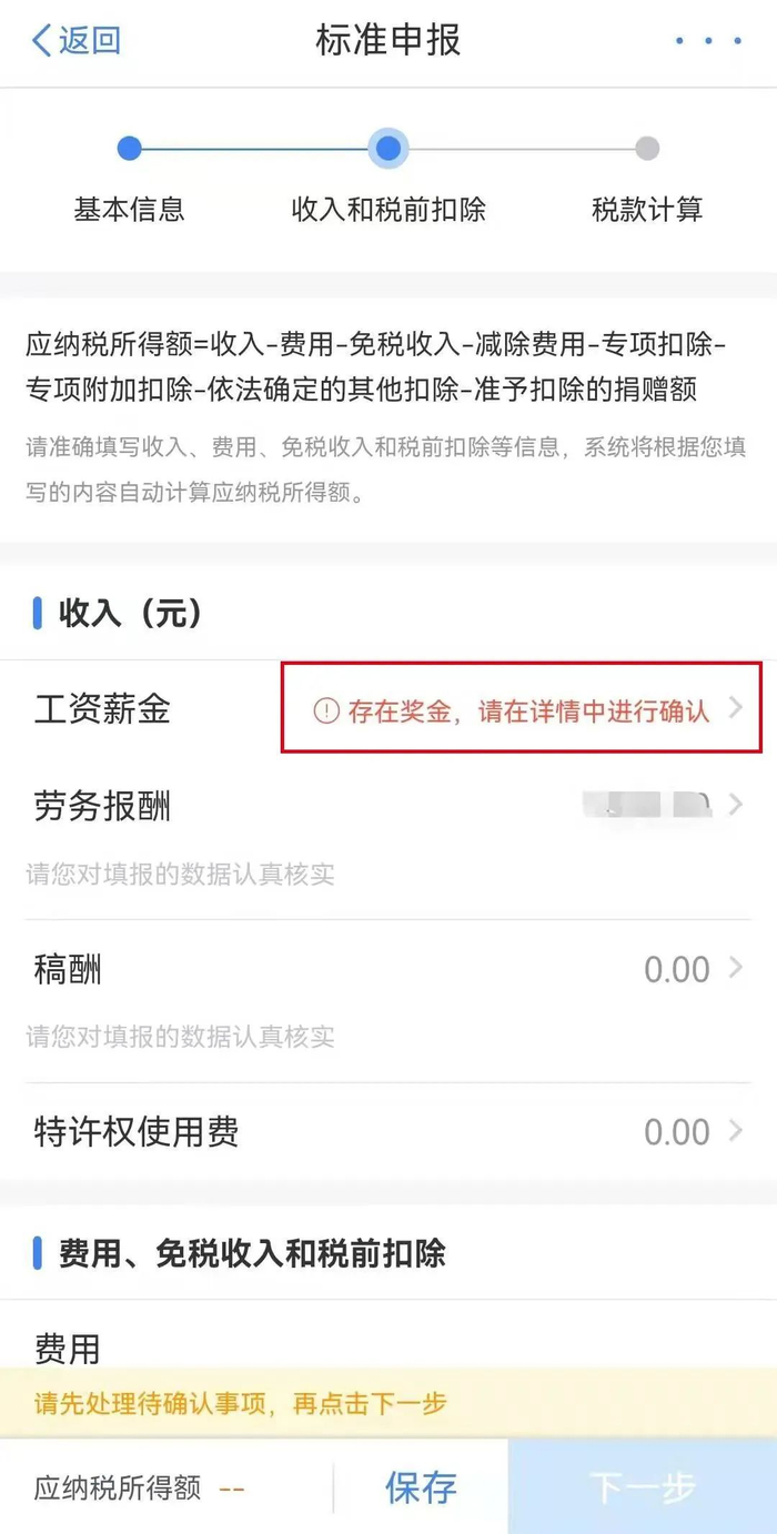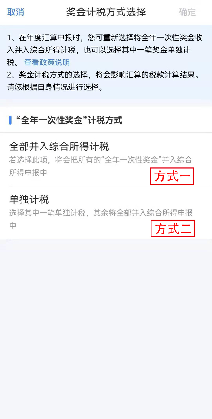 确认收入和税前扣除,如果存在“全年一次性奖金”则点击进入详情页面进行设置。“全年一次性奖金”可选择全部并入综合所得计税,也可选择单独计税。(您选择后可返回申报页面,比对计税结果,选择最优方式进行申报。)