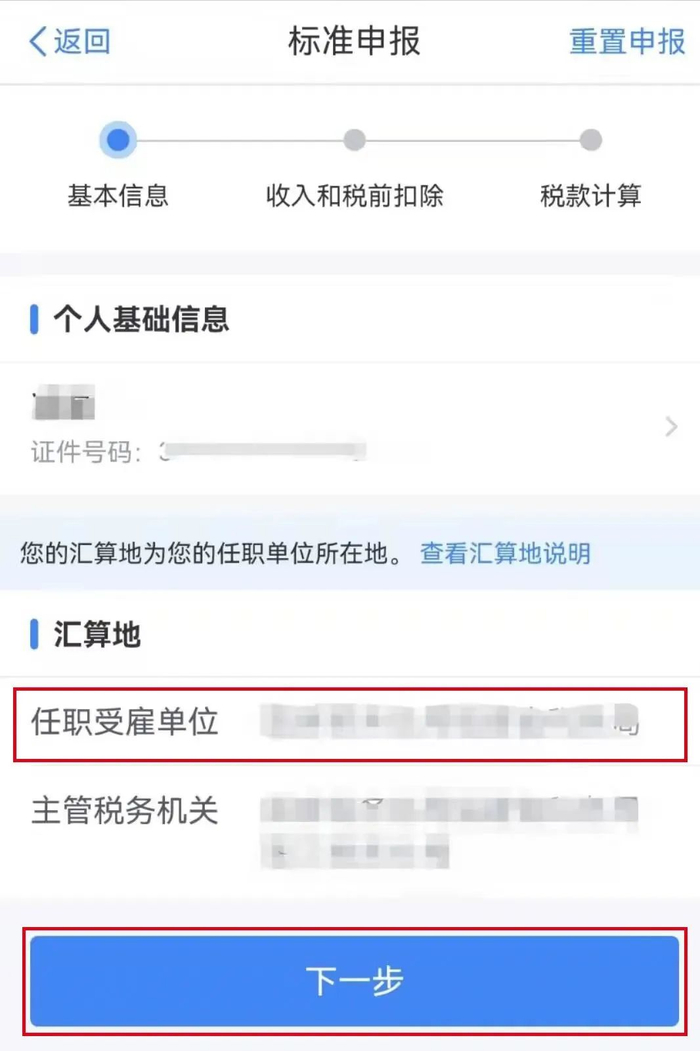 确认个人基本信息,选择或确认“任职受雇单位”,点击下一步。