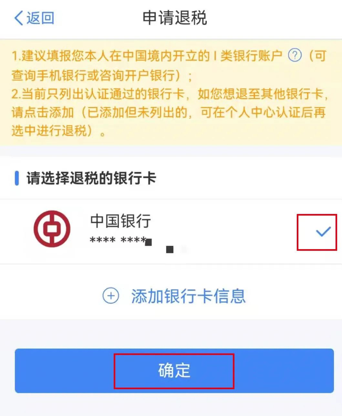 选择已绑定的银行卡,点击“确定”即可完成操作。如果您还没有绑定银行卡,您可以点击“添加银行卡信息”绑定银行卡。退税申报完成后,您可以通过系统首页“我要查询”-“申报查询”-“已完成”模块,查询您的退税进度。