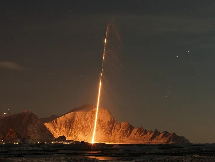 1995年1月25日7时24分,北极地区极夜中的挪威安多亚火箭发射场,一枚民用“黑色布兰特12”火箭发射升空(如图)。很快,俄罗斯摩尔曼斯克州的奥列涅戈尔斯克预警雷达站探测到这枚升空的火箭。该雷达站始建于1963年,是俄罗斯针对弹道导弹袭击的早期预警系统的关键部分。奥列涅戈尔斯克位于科拉半岛上,地处俄罗斯西北角,也是俄罗斯观测来自美国的导弹威胁的最前沿。因为无论是从美国本土发射的民兵洲际导弹,还是美国潜艇发射的三叉戟导弹,若要袭击莫斯科,这一区域都是导弹飞行的最佳途径之一。