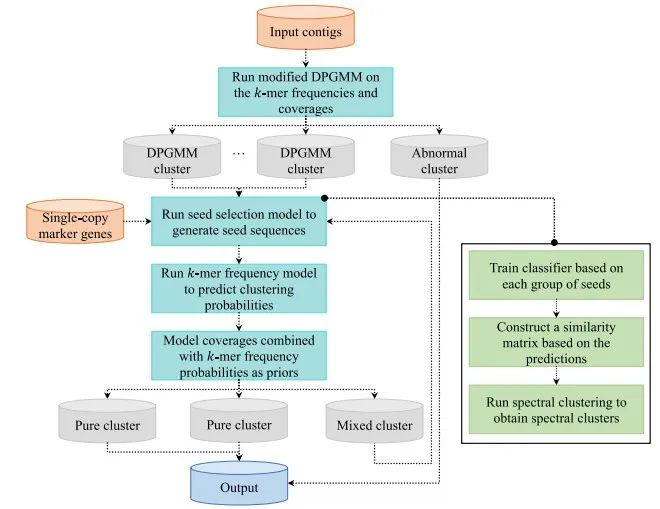 细菌、古细菌等微生物作为地球上现存最古老的生命形式,在生物进化、生命健康、物质循环和环境变化的进程中扮演重要角色。绘制完整基因组序列是研究其系统分类的基础,但受限于微生物基因组序列的复杂性,基于测序技术和序列拼装算法从混合微生物样本中获得完整基因组序列非常困难,尤其对于不可培养的稀有细菌,迄今仅有少量的微生物被测序。因此,急需在聚类方法上突破,开发出从混合微生物序列集(宏基因组)中精准分类的有效工具。