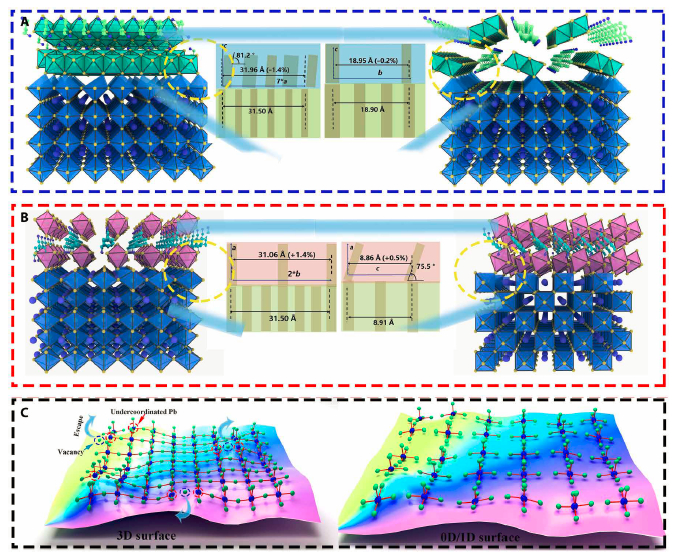 针对以上关键问题,西安交通大学吴朝新团队和合作者香港城市大学任广禹团队合作开发了一种低维类钙钛矿钝化层表面修饰钙钛矿吸光层的方法,有效降低了钙钛矿薄膜晶界和表面处的缺陷态密度。这种一维(1D)和零维(0D)的类钙钛矿,本身具有低的缺陷态密度,同时其晶格抗畸变能力较高。在与底层钙钛矿结合生长时,可进行晶格匹配生长,实现了Pb-I的键合,有效地降低表面的I空位和Pb不饱和配位缺陷密度。通过这种工艺,实现了认证效率24.18%,实验室效率24.49%。同时,得益于低维类钙钛矿的高湿热稳定性,最终钙钛矿器件的稳定性也得到大幅提升,最大功率连续光照输出800h后,还可保持初始效率的90%。这项工作表明,可在钙钛矿上实现晶格匹配生长的、丰富的低维类钙钛矿为高效稳定的钙钛矿器件设计提供了更广泛的选择,为未来设计兼具高效且高稳定钙钛矿器件提供了一个具有参考价值的新策略。