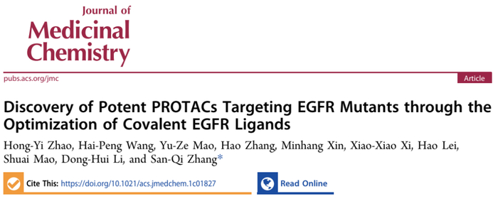 表皮生长因子受体(EGFR)是治疗非小细胞肺癌(NSCLC)的重要靶点。EGFR酪氨酸激酶抑制剂(EGFR-TKIs)虽然在临床上取得了很大成效,但是获得获得性耐药问题大大限制了其临床应用。所以迫切需要开发新的疗法来克服耐药问题。蛋白水解靶向嵌合体(PROTACs)是一种可以诱导靶蛋白降解的双功能分子,利用分子中的E3连接酶配体和靶蛋白配体同时结合靶蛋白和E3连接酶促进靶蛋白泛素化,进而被降解。这一独特作用模式使得PROTACs克服耐药的潜力。研究人员们已经报道了一些EGFR的PROTACs,但是这些PROTACs抗增殖活性或降解活性不够高,难以同时对多种EGFR突变体发挥高效的降解作用。