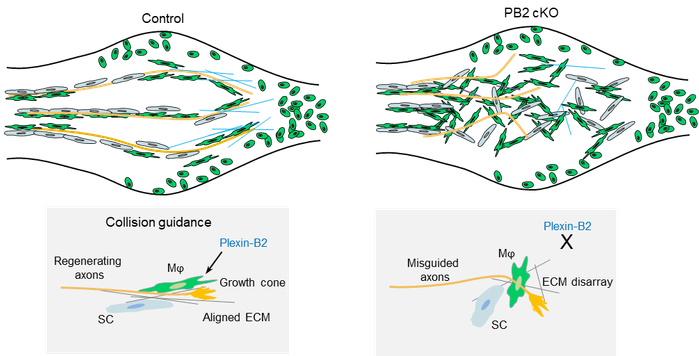 近日,西安交通大学第二附属医院骨二科贺西京教授研究团队与美国西奈山伊坎医学院Hongyan Zou教授团队共同合作,创新性地发现巨噬细胞在外周神经损伤修复中的指导作用。巨噬细胞通常被认为在组织损伤后具有介导炎症反应、清除细胞碎片的作用,此项研究表明巨噬细胞通过沿着神经长轴有方向的运动和排列重组细胞外基质,指导轴突再生和再髓鞘化促进神经再生。这一过程中Plexin-B2表达的上调起着至关重要的作用,其机制与物理接触以及细胞碰撞有关。