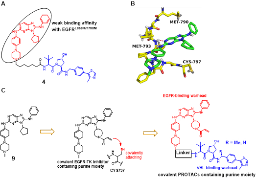 (A)该团队先前报道的可逆PROTAC的结构 (B)化合物9(绿色)和EGFRT790M (黄色,PDB:3ika)的对接模型