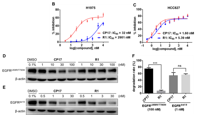 (D,E)R1和CP17对EGFRL858R/T790M和EGFRdel19降解活性的测定结果;(F)为(D,E)的统计结果