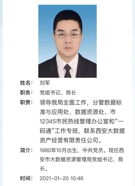 西安市大数据资源管理局官网当时的信息显示,刘军1980年10月出生,中共党员,领导该局全面工作,分管数据标准与应用处、数据资源处、市12345市民热线管理办公室和“一码通”工作专班,联系西安大数据资产经营有限责任公司。