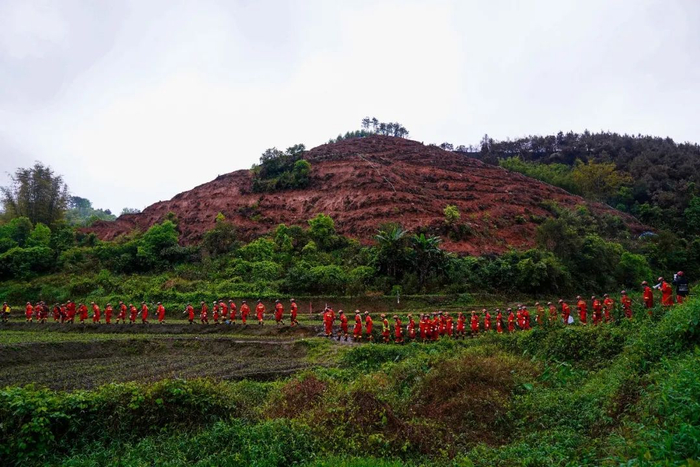 队长将搜救区域划分网格、编组作业、轮番上阵,我们一组六人编为绳索专业队,专门攻坚陡峭难上的坡地。我们翻着一座一座山寻找着生还者,山坡凶险陡峭,杂草丛生,部分坡地和水平面成70度角,较难攀爬,我和队友始终都没有放弃,走不通的路,我们就在附近树干上打个支点,另一头结绳而下,一寸一寸搜遍所有区域。黑夜来临,我们拿出了移动照明灯组、手提式强光照明灯,队友们相互协作,共同配合,整座山头被星星点点的灯光照得发亮。