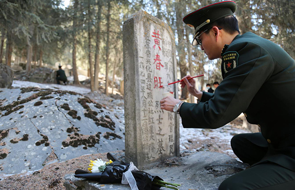 乌鲁木齐军事检察院检察官来到革命公墓,清扫烈士墓碑上的松针和积雪,向先烈致以深切哀思。图为检察官为褪色的英烈墓碑描红碑文。通讯员彭建摄