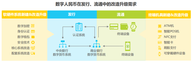 数字人民币带动的产业非常广泛,数字人民币的落地在央行发行方面,需要加密技术与网络安全,商业银行管理服务方面IT系统需要升级改造,ATM需要升级相关服务;在流通环节,需要对POS机等软硬件设备升级、对数字钱包应用进行普及。