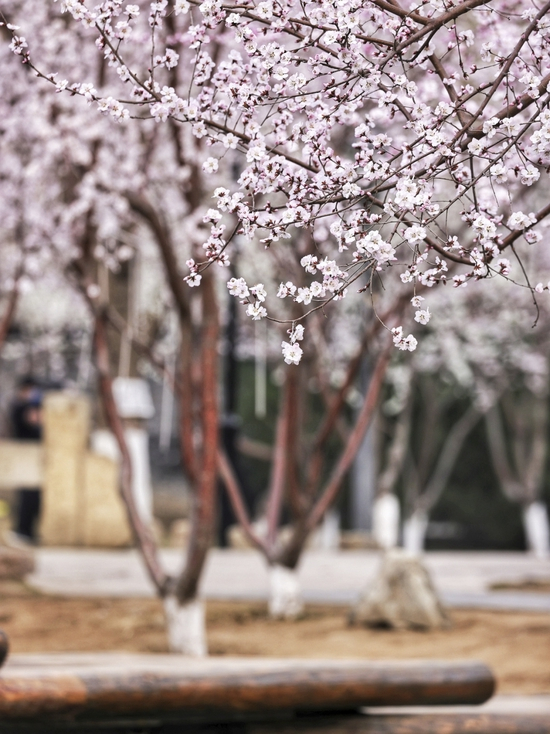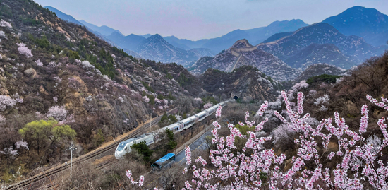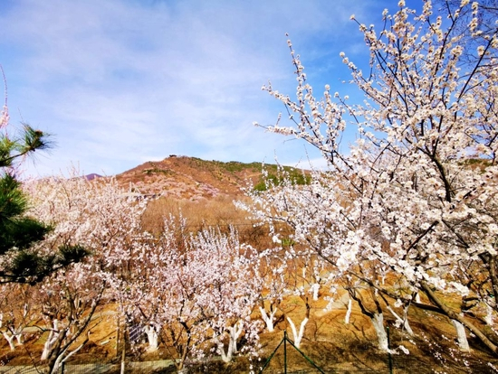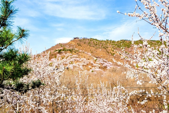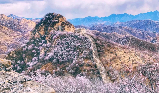 坐上小火车穿行在巍峨群山之间,远处延绵起伏的长城盘踞在山脊线上,近处漫山遍野分布着粉色的山桃花、浅白色的杏花。