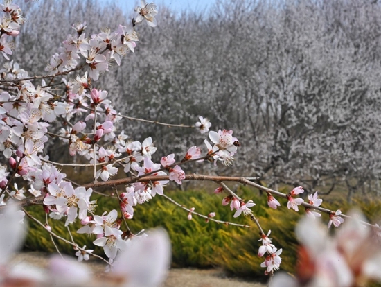 大桃树在春风中开得洋洋洒洒,小桃树含苞待放、娇羞可人。
