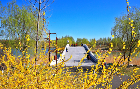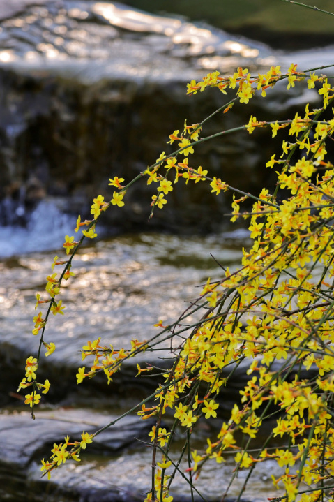 公园内近千株的迎春花也相继盛开,点点鲜黄色小花缀满绿色的枝条,营造出春意浓浓的迷人景色。