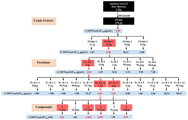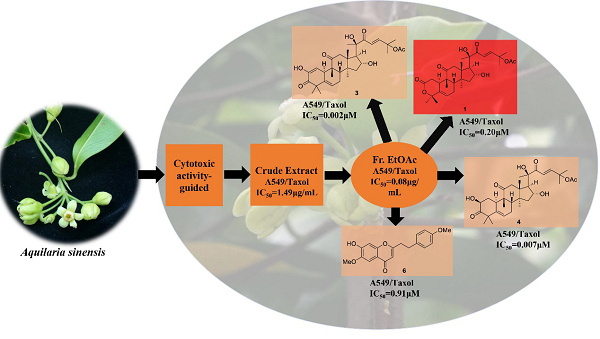 通过抗癌活性追踪分离,最终发现三个葫芦烷三萜和一个2-(2-苯乙基)色酮类化合物,对人肺腺癌SPC-A-1、人肺鳞状细胞癌NCI-H520和人肺腺癌A549细胞均有显著的抑制活性。非常有意义的是,葫芦素E(IC50 = 0.002 μM)、葫芦素B(IC50 = 0.007 μM)、沉香内酯A(IC50 = 0.20 μM)和7-羟基-6-甲氧基[2-(4-甲氧基苯基)乙基]-4H-1-苯并吡喃-4-酮(IC50 = 0.91 μM)对紫杉醇耐药的人肺腺癌A549细胞株(A549/Taxol)的抑制活性,明显高于紫杉醇(IC50 = 1.80 μM)。该研究为土沉香花的开发和利用提供了新的思路。研究结果发表在天然产物研究国际期刊Natural Products and Bioprospecting(2022, 12: 11)上。