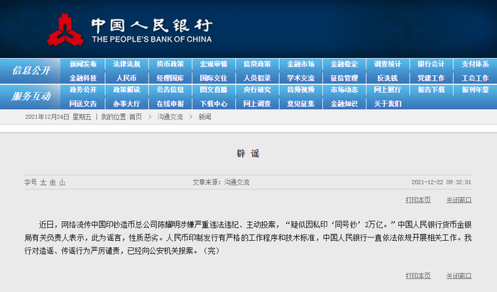 中国人民银行在辟谣中指出,人民币印制发行有严格的工作程序和技术标准,中国人民银行一直依法依规开展相关工作。人民银行对造谣、传谣行为严厉谴责,已经向公安机关报案。